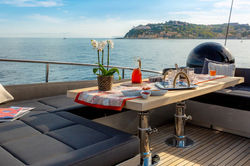 The aft cockpit is ideal for al fresco entertaining, equipped with built-in upholstered seating, a table, sun pads and a 42-inch waterproof television screen. Up on the flybridge, amenities include four lounge chairs, sun pads, a wet bar and a Jacuzzi beneath a removable sun shade. The foredeck offers more outdoor relaxation, fitted with built-in seating, a table and sun pads, sheltered by a Bimini top.